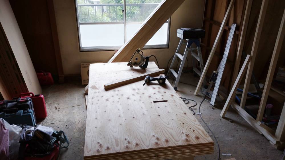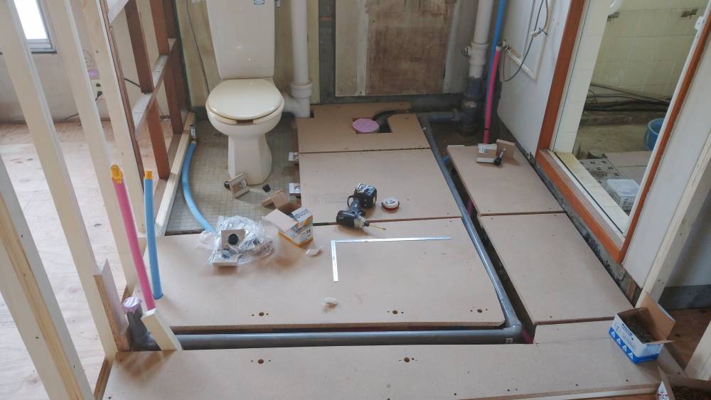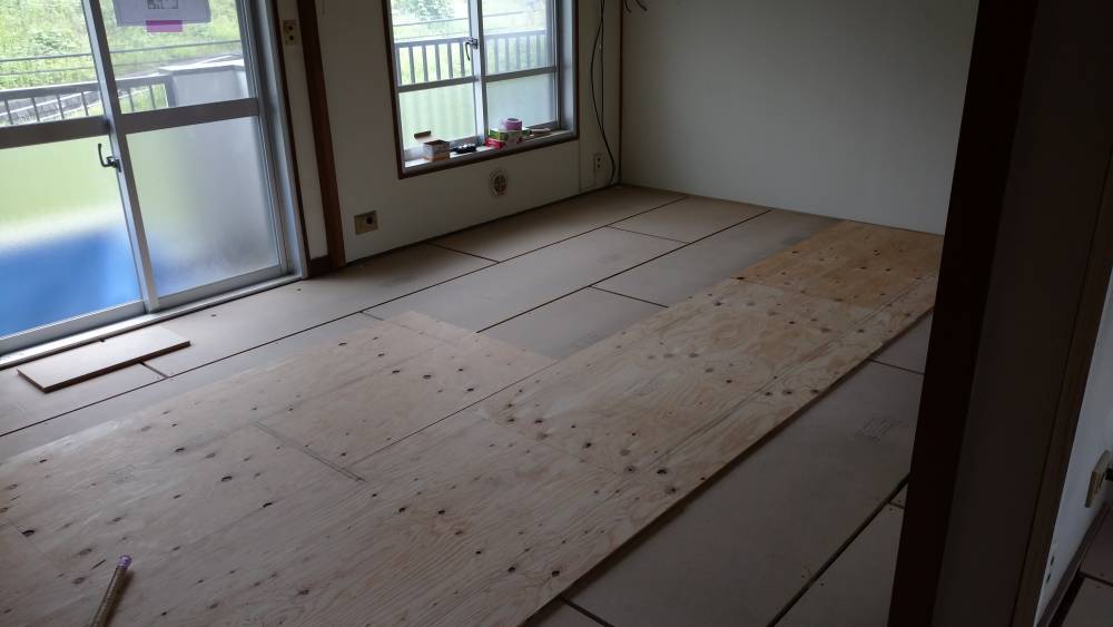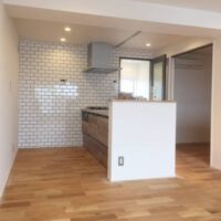床にフロアタイルを貼り、壁の一部にアクセントクロスを取り…