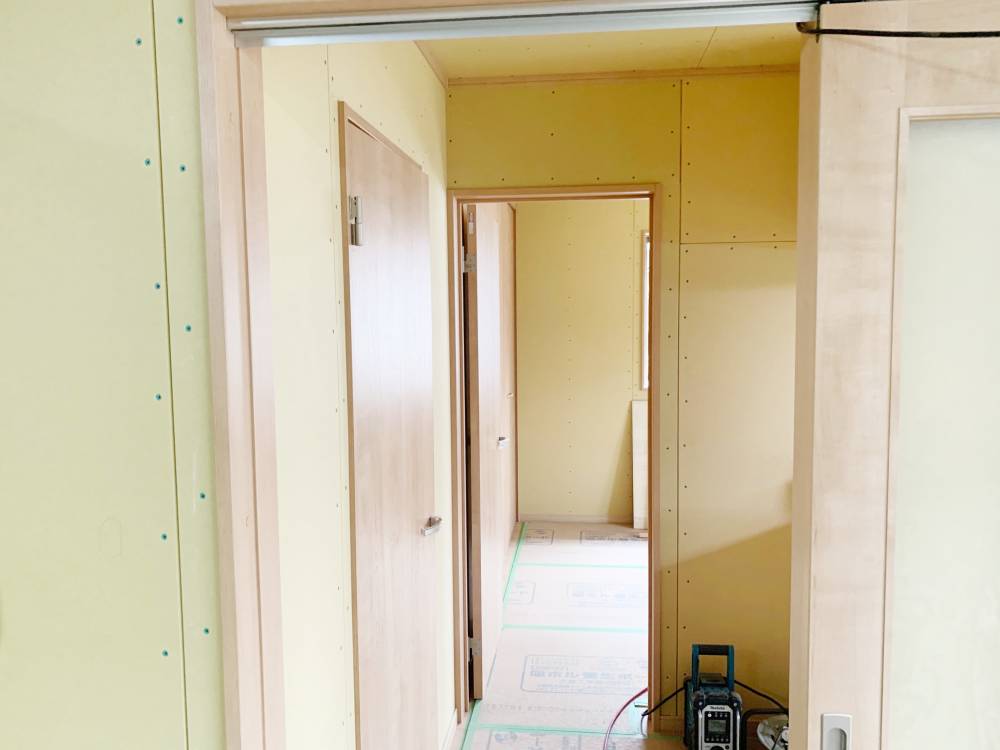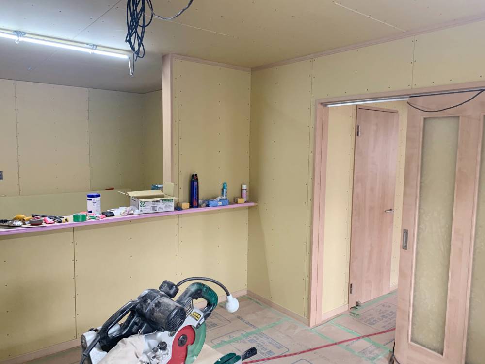床にフロアタイルを貼り、壁の一部にアクセントクロスを取り…