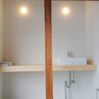 床にフロアタイルを貼り、壁の一部にアクセントクロスを取り…