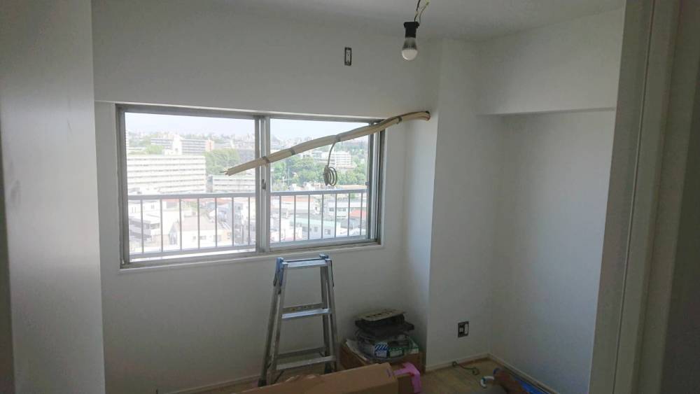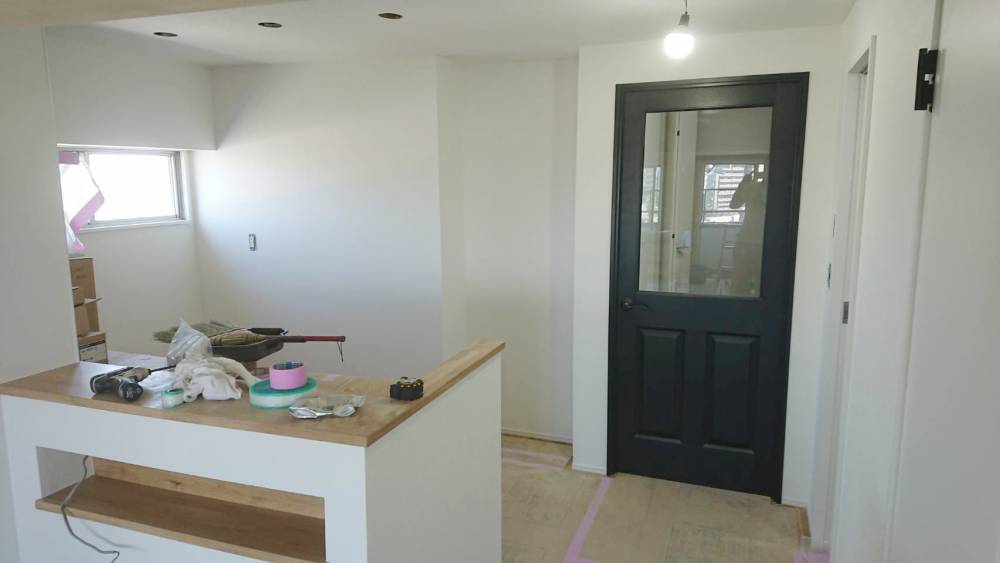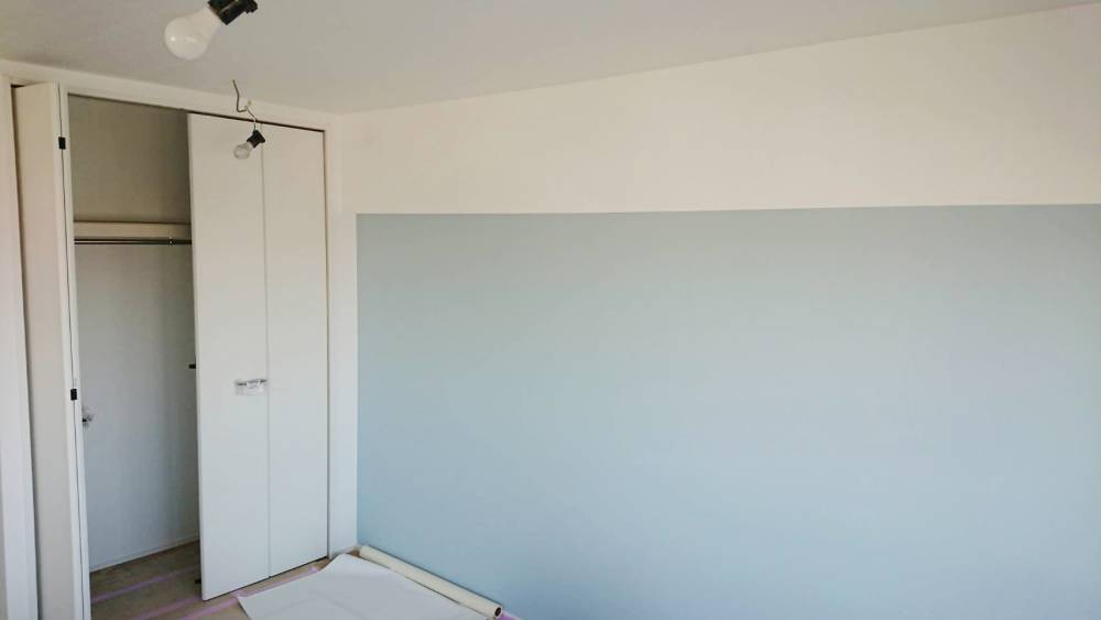 床にフロアタイルを貼り、壁の一部にアクセントクロスを取り…