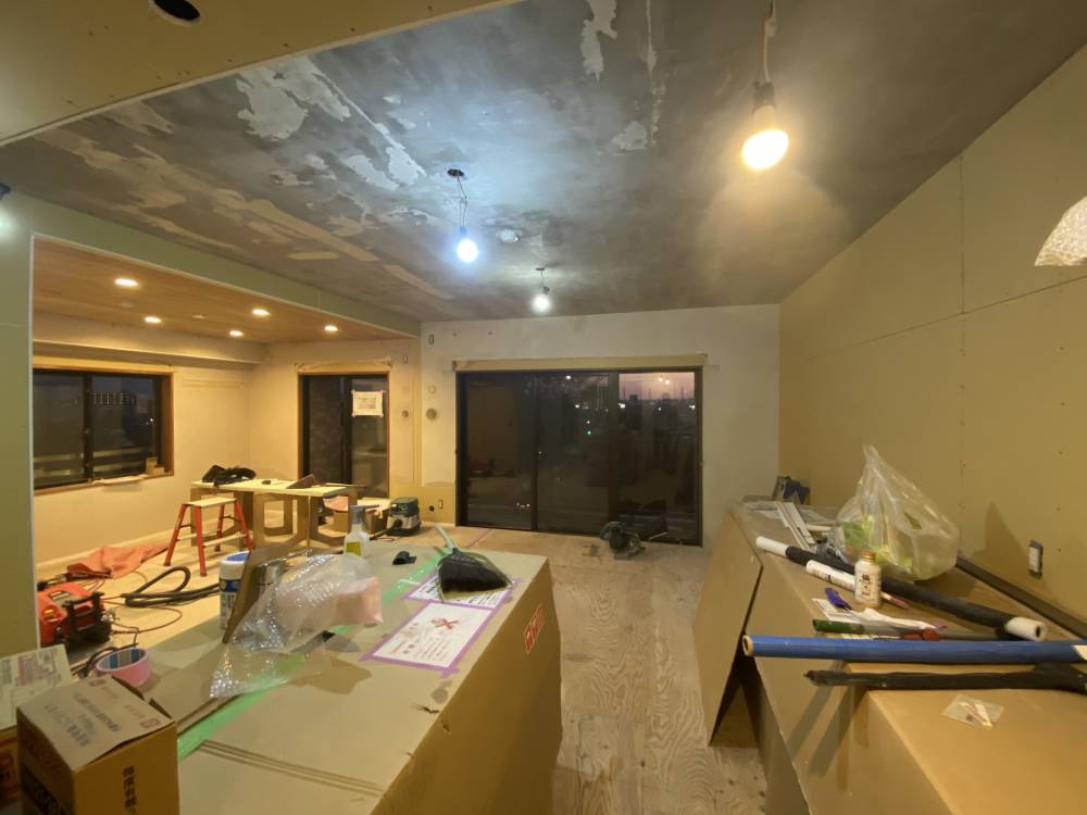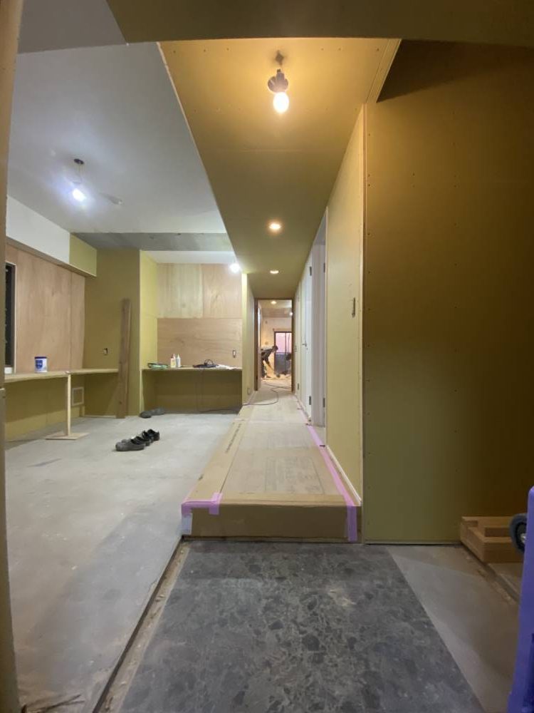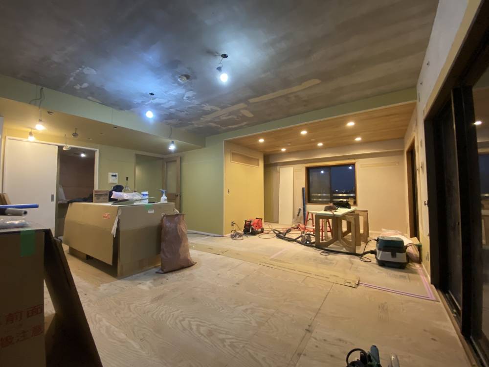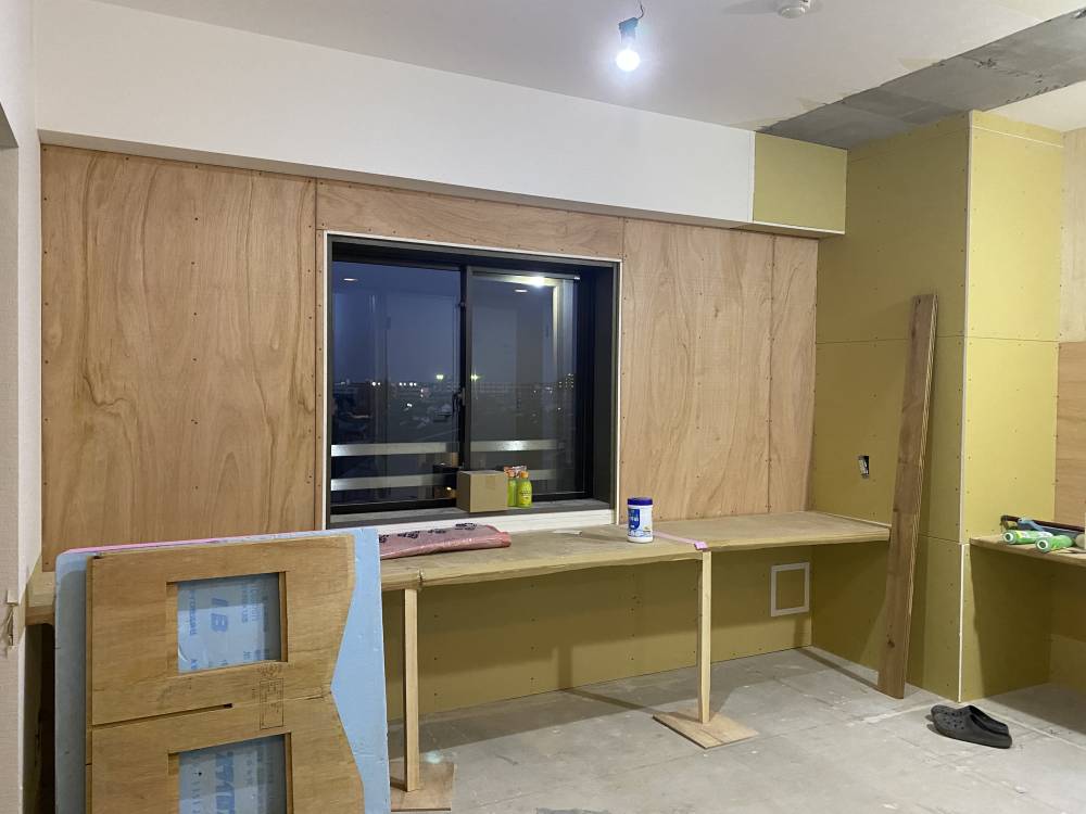 床にフロアタイルを貼り、壁の一部にアクセントクロスを取り…