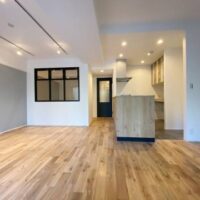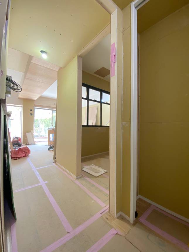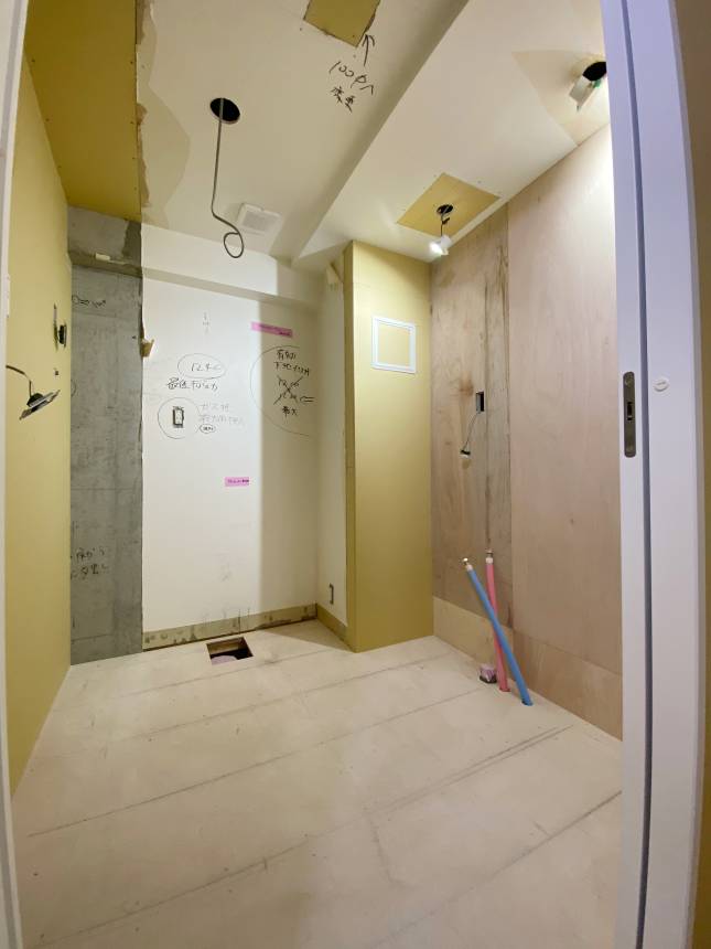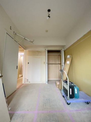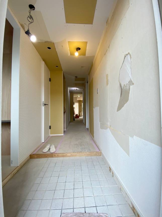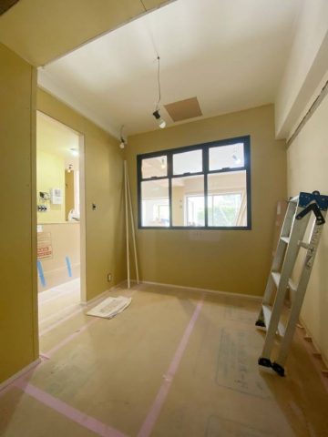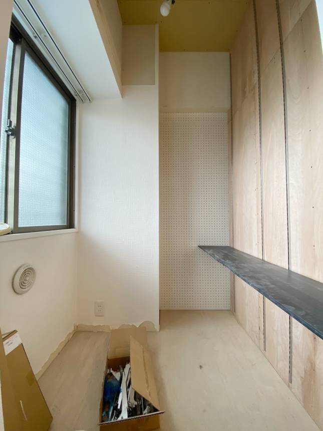 床にフロアタイルを貼り、壁の一部にアクセントクロスを取り…