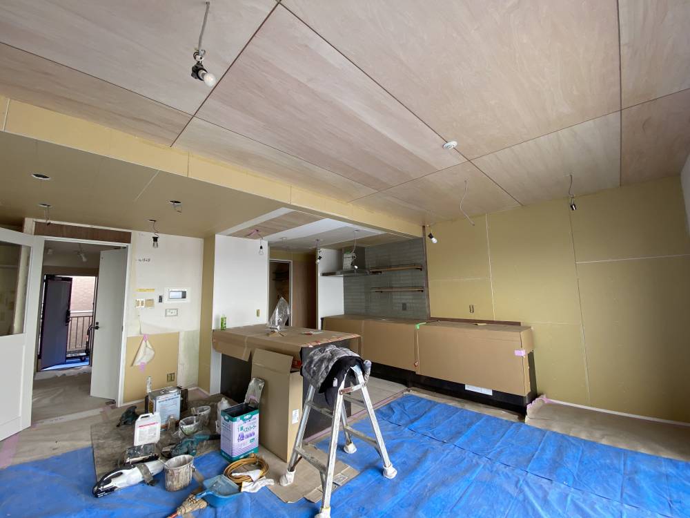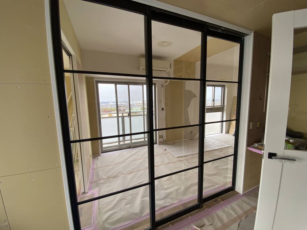 床にフロアタイルを貼り、壁の一部にアクセントクロスを取り…