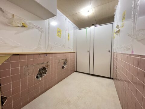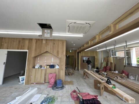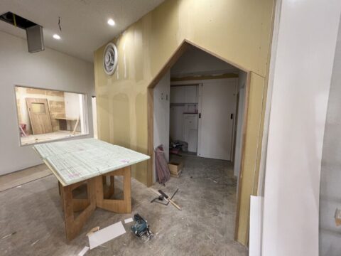 床にフロアタイルを貼り、壁の一部にアクセントクロスを取り…